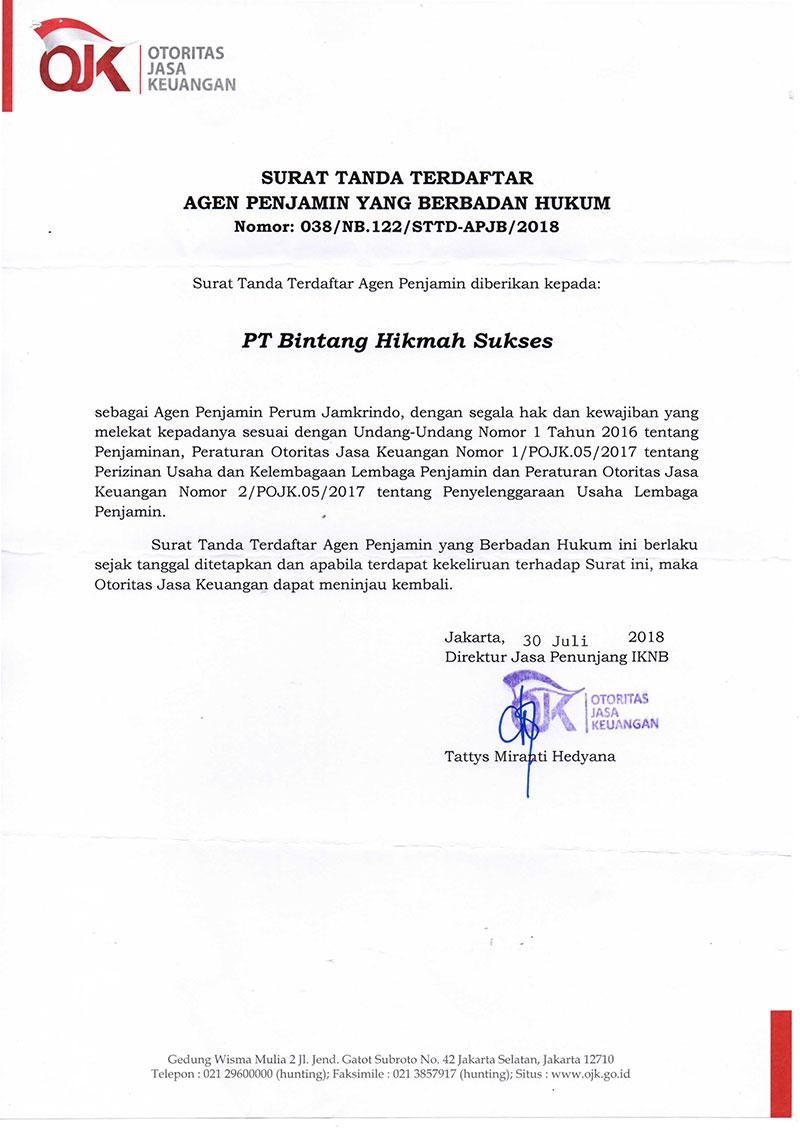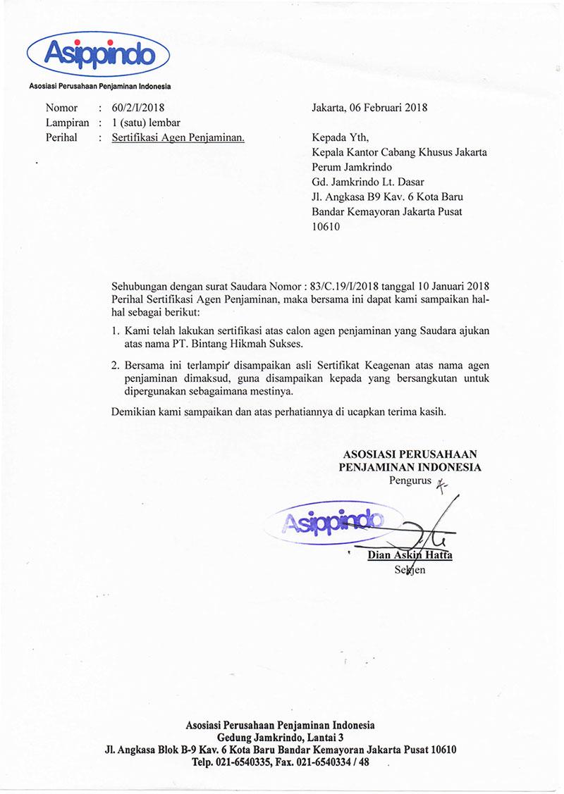 PT. BINTANG HIKMAH SUKSES adalah agen terpercaya jasa pembuatan surety bond dan bank garansi berlokasi di Kebon Sirih Jakarta Pusat.